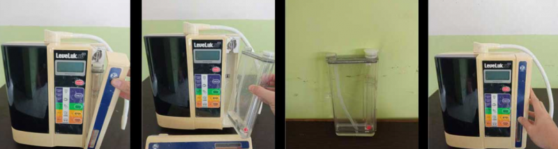 Sebelum mengganti selang water supply, dikarenakan kita akan membalikkan mesin Kangen Water kita nantinya, kita butuh untuk TERLEBIH DAHULU mencabut tangki electrolysis enhancer yang ada di samping kanan mesin Kangen Water. Jika tangki electrolysis enhancer anda (yang berisi cairan garam) ini penuh terisi, melepaskannya akan menghindari cairan garam ini tumpah ketika kita akan membalikkan mesin nantinya. Taruh tangki electrolysis enhancer ini di tempat yang aman untuk sementara waktu, lalu tutup kembali cover penutup tangki tersebut.