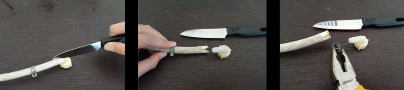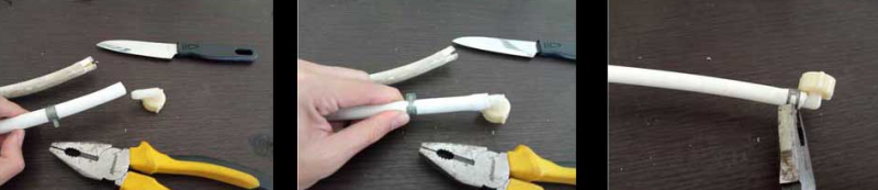 Selanjutnya gunakan pisau dan iriskan selang perlahan-lahan sampai selangnya terbelah dua agar kita bisa melepaskan selang yang usang tersebut dari soketnya (harap hati-hati pada bagian ini agar soketnya tidak patah). Ambil soket sekrup serta ring penguncinya yang nanti akan kita masukkan ke selang yang baru.